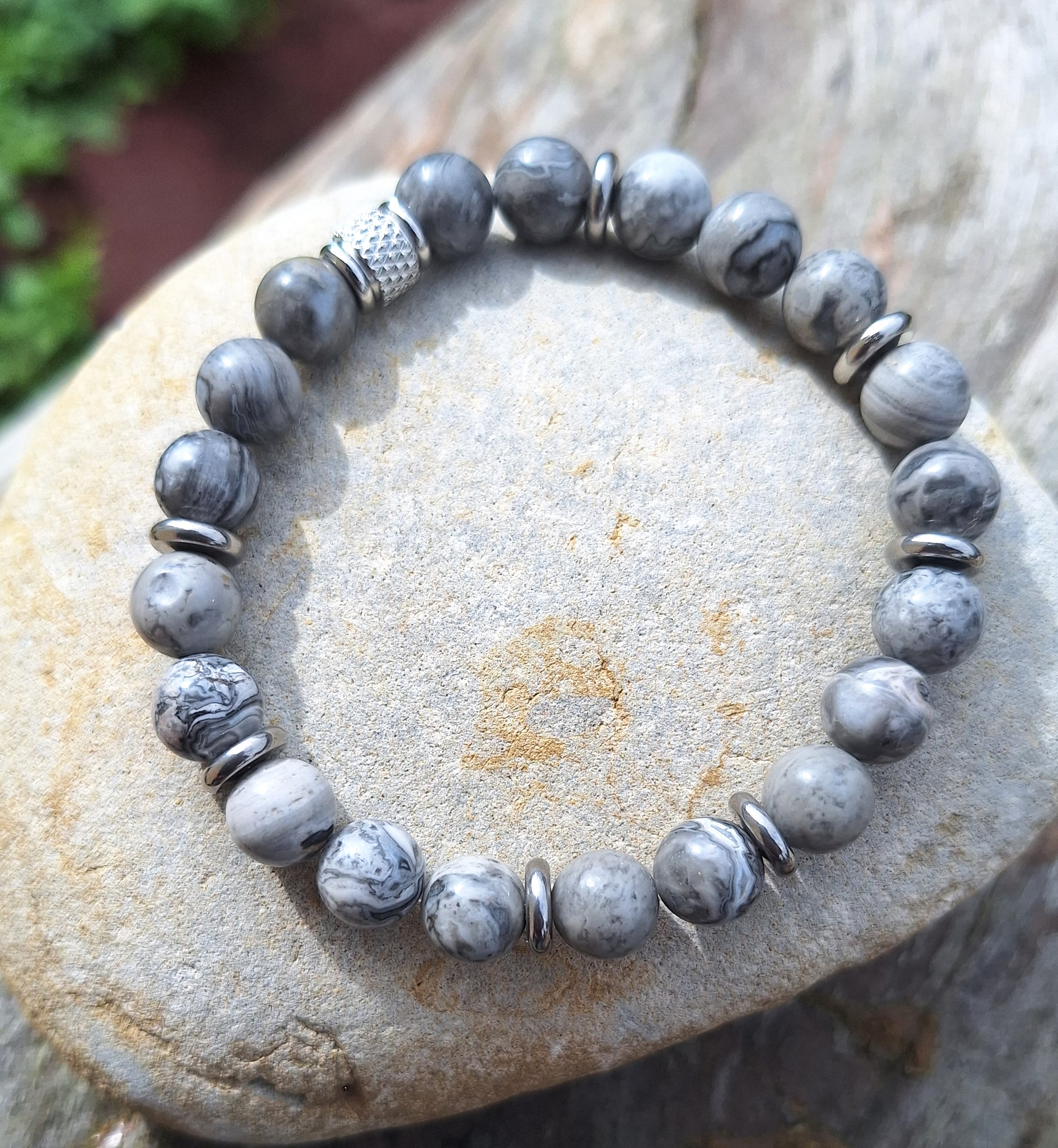 Pierre de joie et d’élan créatif, le Jaspe Picasso gris encourage à sortir de sa zone de confort. Il favorise les initiatives et pousse au passage à l’action. Il canalise les énergies dispersées pour permettre de mener à terme un projet, même ambitieux. Relié à la Terre Mère, il revitalise les chakras et offre une stabilité intérieure. Cette pierre aide aussi à se sentir protégé et en sécurité, ce qui facilite le lâcher-prise et apaise les émotions trop intenses. En portant le Jaspe Picasso, on développe une ouverture au monde, plus de curiosité et une meilleure capacité à s’émerveiller de ce qui nous entoure.