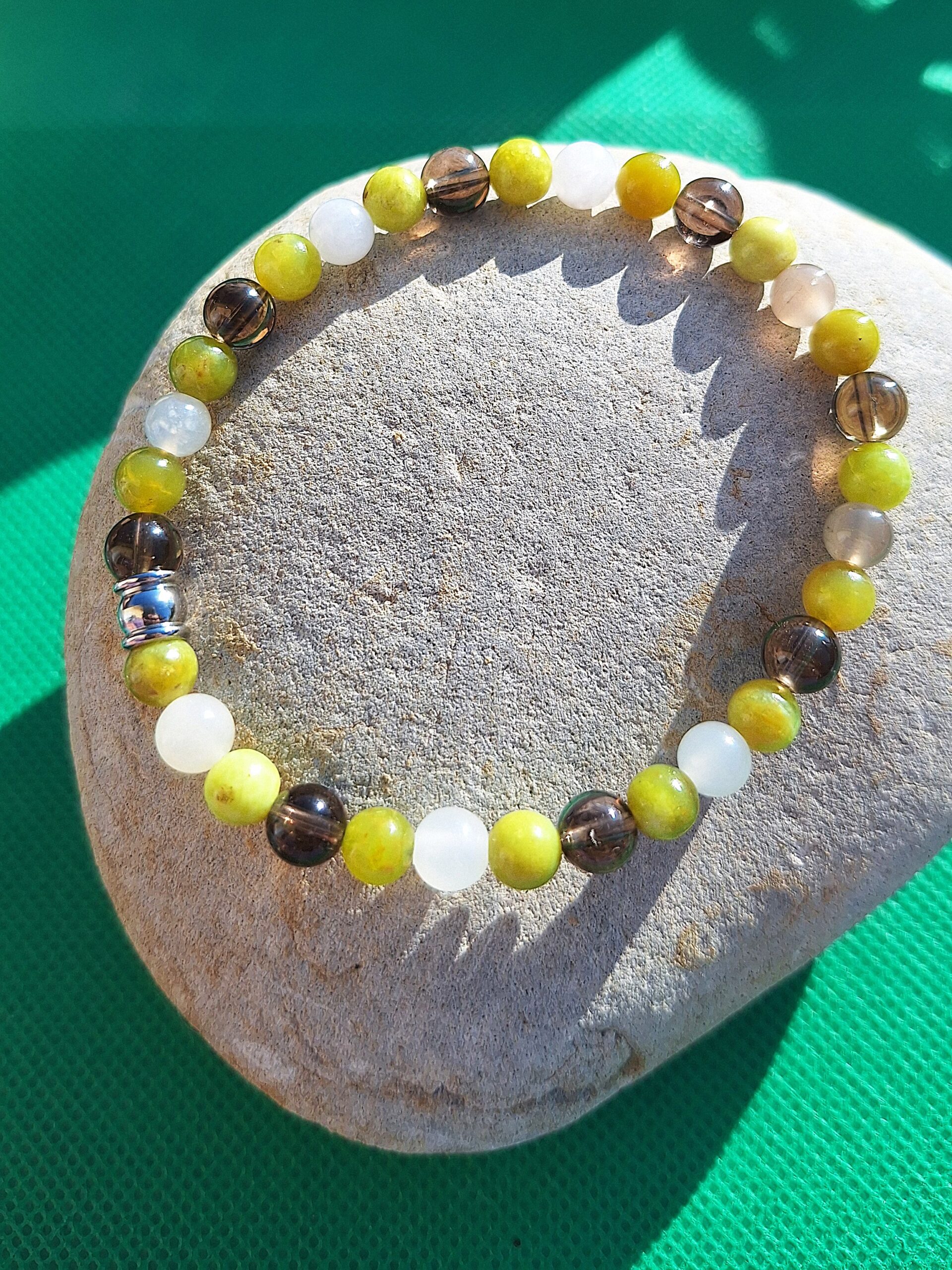 Découvrez ce bracelet en pierres naturelles composé d’Opale verte, de Quartz fumé et de Pierre de Lune blanche (perles de 6 mm). Il a été conçu pour accompagner l’ancrage, l’équilibre émotionnel et l’harmonisation énergétique au quotidien. Grâce à l’association de ces trois minéraux complémentaires, il offre une synergie idéale pour retrouver stabilité et sérénité, notamment lors des périodes de transition.