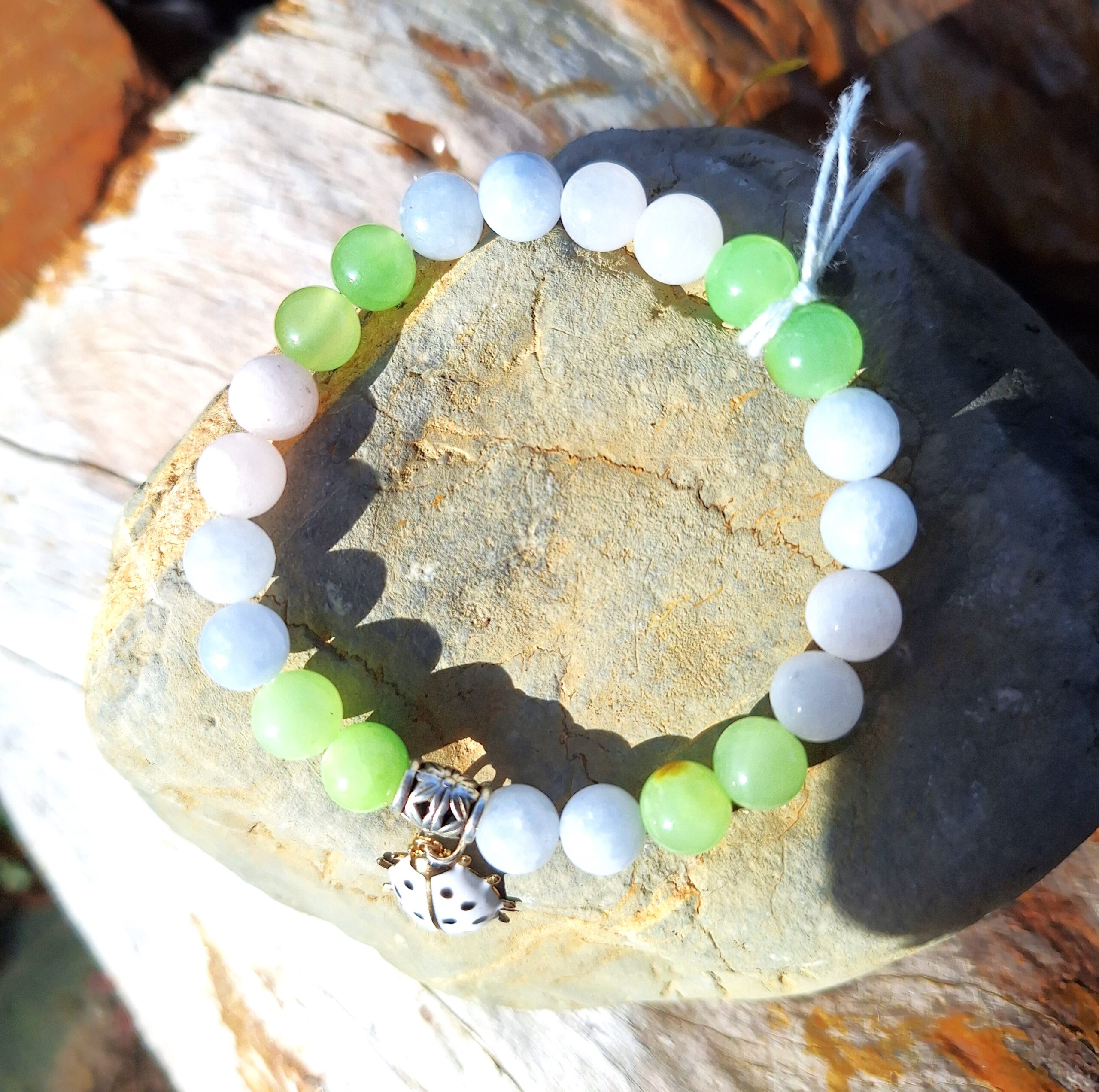 Bracelet en 8mm composé de Calcite bleue, rose très pale, verte
