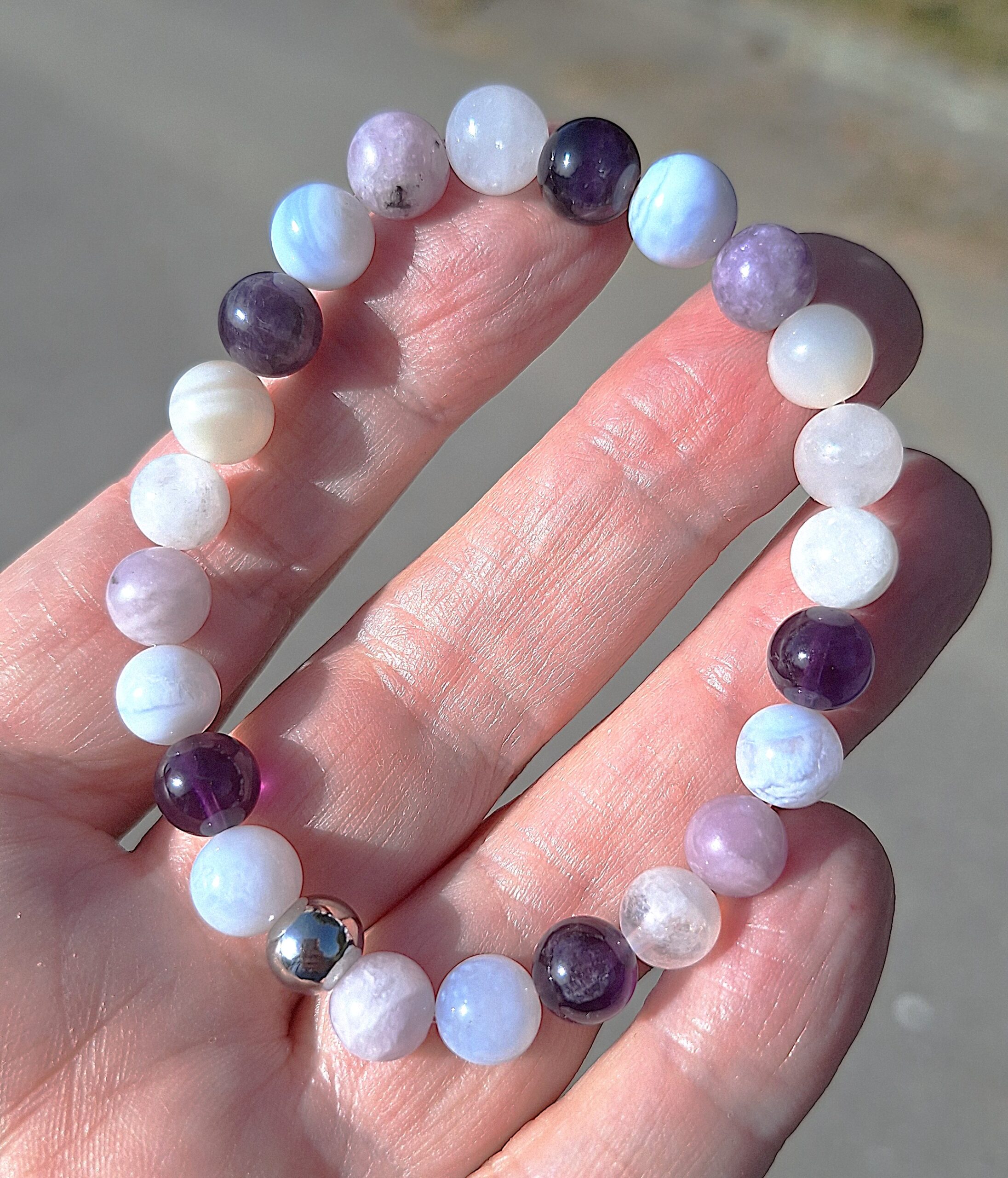 En synergie, ces pierres créent une vibration douce et complémentaire. Elles apaisent le mental, stabilisent les émotions, soutiennent l’équilibre hormonal et facilitent l’expression émotionnelle. Ainsi, le bracelet aide à traverser la ménopause avec plus de calme, de confort et d’harmonie. Portez-le au quotidien, de jour comme de nuit, pour bénéficier pleinement de ses effets. Néanmoins, faites attention : la Lépidolite contient du lithium. Consultez un médecin si vous prenez des antidépresseurs.