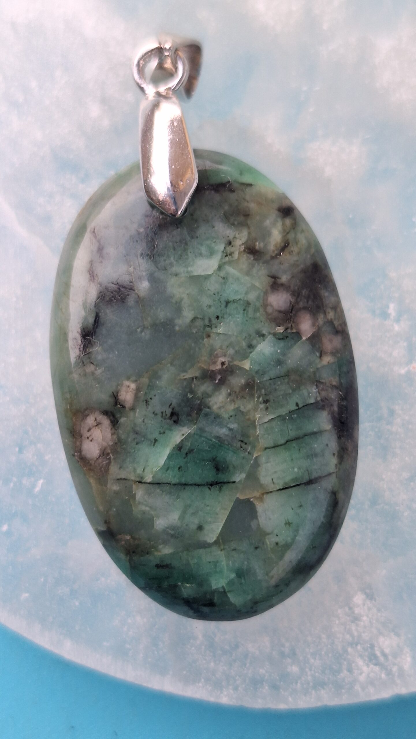 Ce pendentif en Emeraude naturelle de 5×2 cm( bélière inclue ) accompagne celles et ceux qui recherchent l’équilibre émotionnel, la douceur relationnelle et un profond renouveau intérieur. Il possède une bélière en acier inoxydable et sera livré avec un cordon noir.