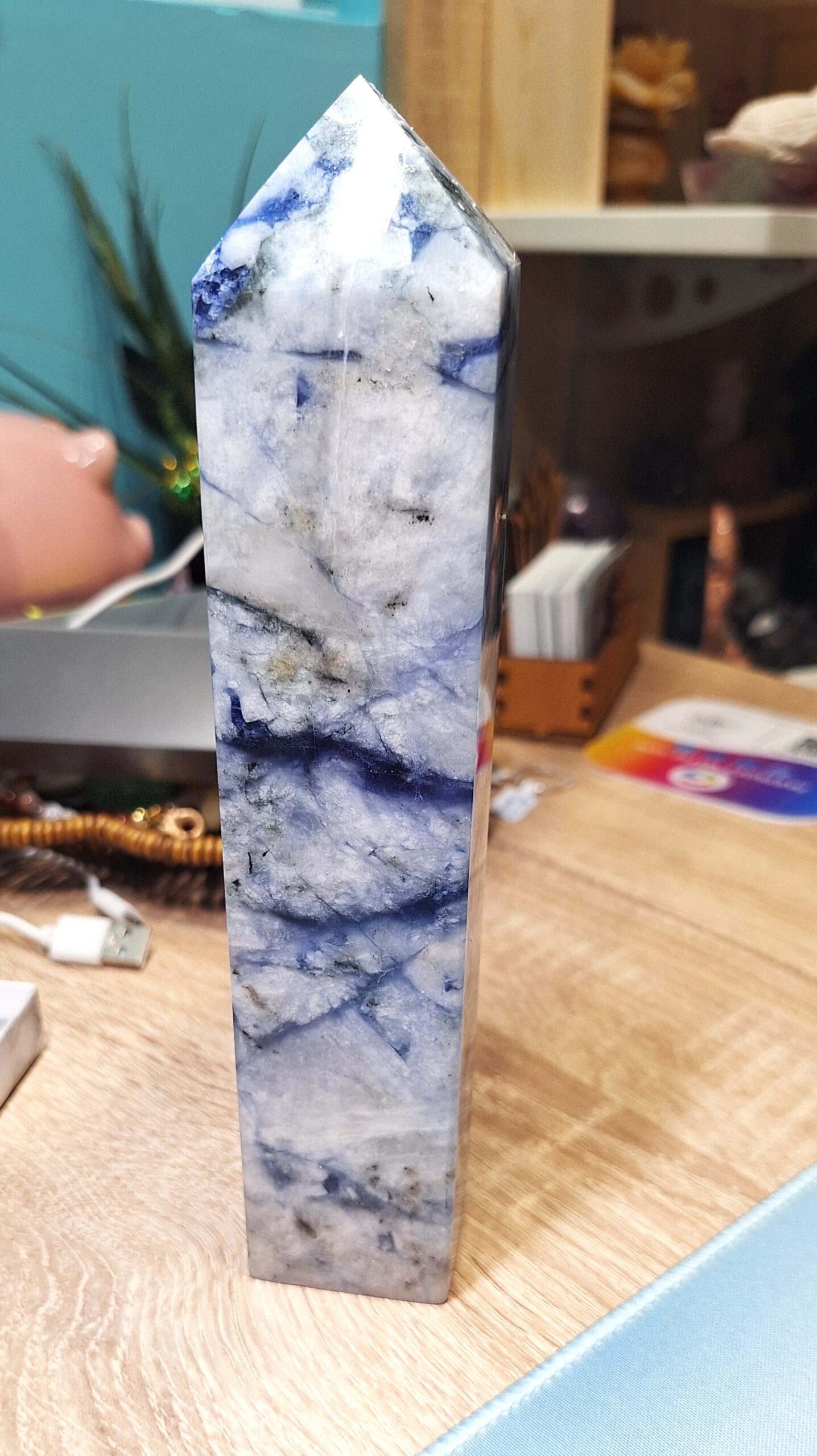 Découvrez cette tour en Afghanite, une pierre naturelle rare que je vous présente ici dans un grand spécimen. Peu connue, l’Afghanite possède pourtant une vibration remarquable. Sa teinte bleue profonde, parfois marbrée de blanc ou de gris, invite immédiatement au calme intérieur. Ainsi, elle soutient l’ouverture de la conscience et la clarté mentale.